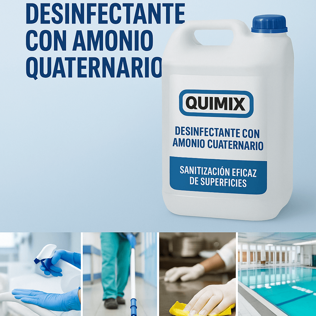 Desinfectante con Amonio Cuaternario es un potente desinfectante y limpiador formulado para eliminar suciedades y destruir microorganismos en diversas superficies. Gracias a su alta concentración, el producto se puede diluir, obteniendo un mayor rendimiento y eficiencia, lo que lo convierte en una opción económica para la limpieza. Además, es un excelente alguicida, demostrando efectividad contra algas presentes en piscinas.