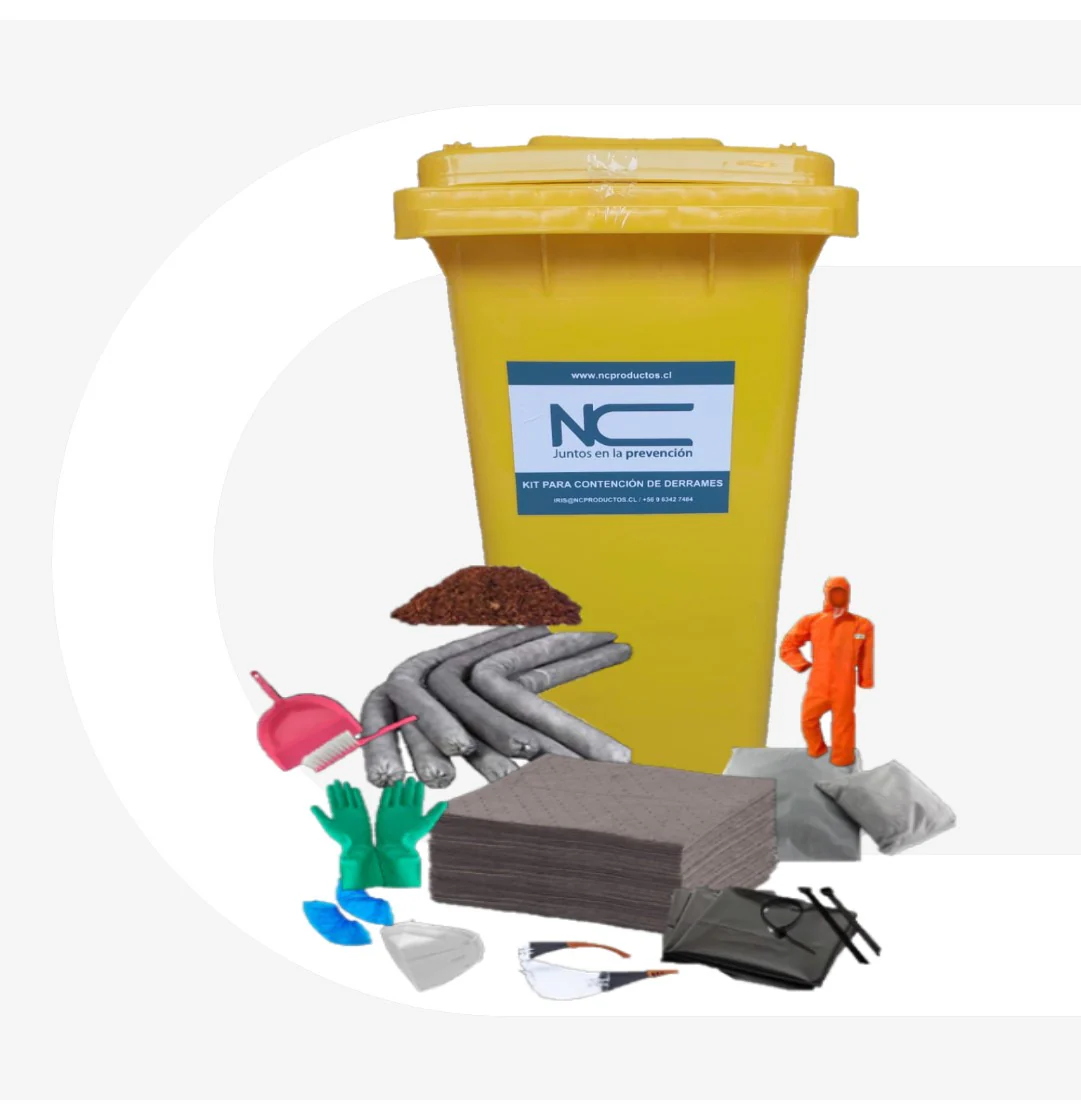 Incluye absorbentes especializados, elementos de contención y elementos de protección básica para el operador.